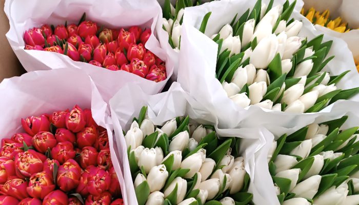 Более экономный вариант — цветы из овощных киосков. Там 5 шт. можно приобрести из 450-500 руб., но нет выбора: красные или желтые. Те же, что по дороже, разнообразны на оттенки: белые, розовые, малиновые, бордовые, фиолетовые, оранжевые пестрые — двухцветные и т.д.
