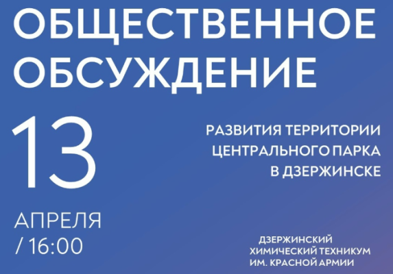 А 13 апреля состоятся общественные слушания по благоустройству территории Центрального парка культуры и отдыха (восточная часть). Администрация города приглашает всех неравнодушных дзержинцев принять активное участие в предстоящем обсуждении.