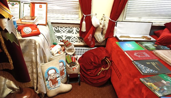 Ну а сам Дед Мороз, пока курсирует между остановками, может и телеграмму отбить, и позвонить, и попить чай из большого самовара.