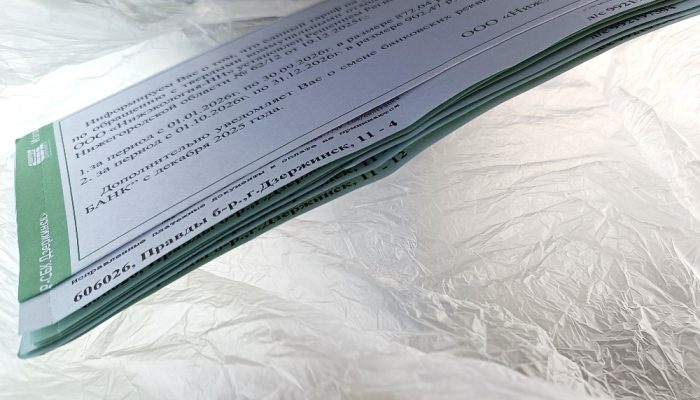 К слову, только вчера мы писали о том, что квитанции за ЖКУ за январь 2026 г. “застряли” в Дзержинске. Сразу после этого от Центра СБК платежки начали разносить по домам, в том числе таким вот “экспресс методом”.