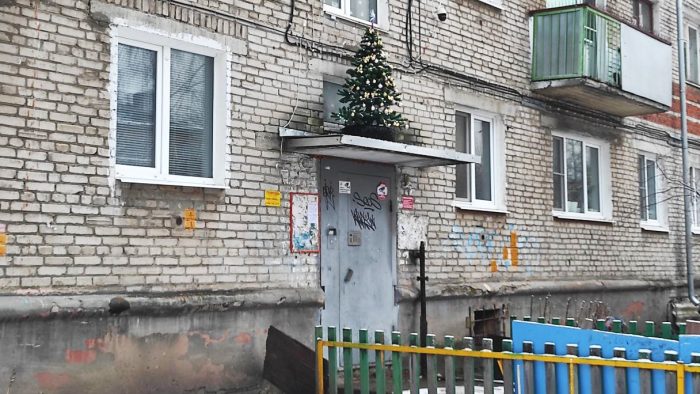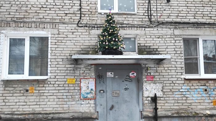 Жители нашего города наряжают новогодние елки не только в квартирах и офисах. Если есть запрет на украшение искусственного деревца в подъезде, то можно это сделать… над подъездом.