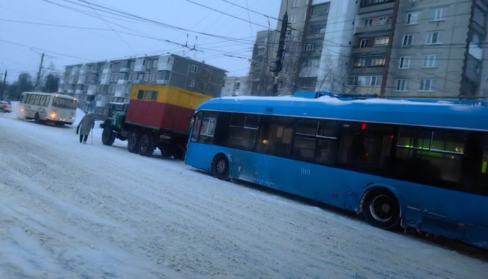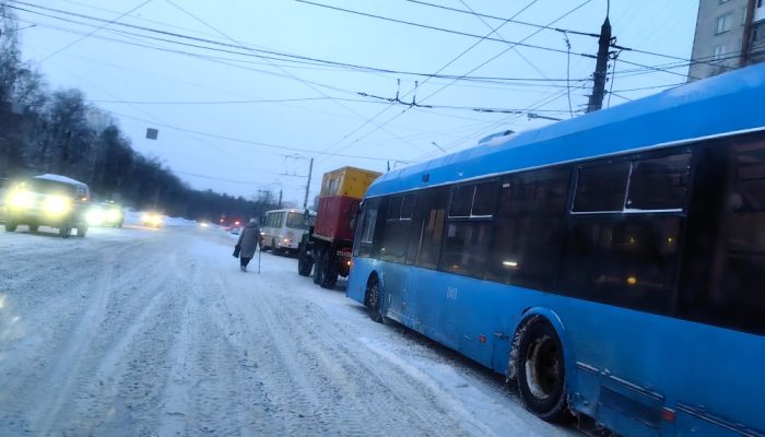 Из-за этого было затруднено движение других ТС. Кстати, видно, что проезжая часть ул. Гайдара в этом месте довольно сильно занесена снегом. Быть может, именно это стало причиной поломки иди какого-то ДТП с участием троллейбуса.