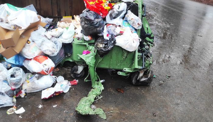 Прошла почти неделя, но на месте пожара все осталось без перемен – пострадавший бак продолжает служить для сбора мусора.