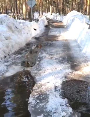 Многие дороги залиты водой и представляют собой сплошные глубокие лужи. Резиновые сапоги могут не спасти — нужны болотники. По обочинам — огромные груды снега, высотой около 3 метров.
