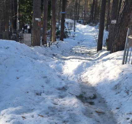 От снега более-менее расчищены только центральные дороги, и то ближе к началу кладбища. Второстепенные же дороги (тоже асфальтовые с указателями, знаками и номерами участков) полностью завалены снегом. В лучшем случае по ним протоптаны тропы.