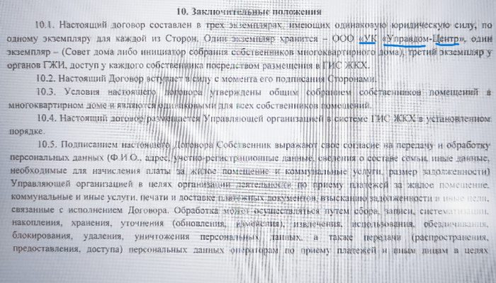 Договор управления с ДТК жители МКД в НН заключили на 5 лет. В нем все стандартно – по управдомовскому шаблону. В главе 10 «Заключительные положения» говорится, что договор составлен в 3-х экземплярах. Один находится в ГЖИ НО, второй у собственников, а третий – в… «Управдом-Центре». Забыли здесь поменять название УК, взяв за основу управдомовский договор.