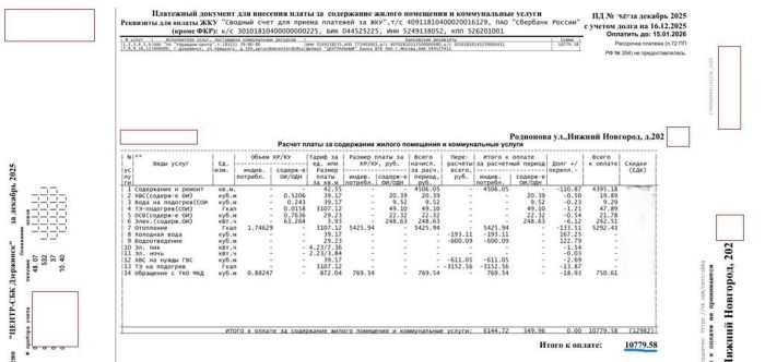 Объективно из платежек с огромными суммами доплат на поверхности — уже есть одно нарушение. По ФЗ если доплата превышает среднемесячный платеж за ЖКУ на 25%, необходимо выставить сумму к оплате с рассрочкой. При платеже в 10 800 руб. за предыдущий месяц, «добавка» в 9 500 тянет на повышение в 78%(!). То есть рассрочку здесь нужно было предложить жителям однозначно.