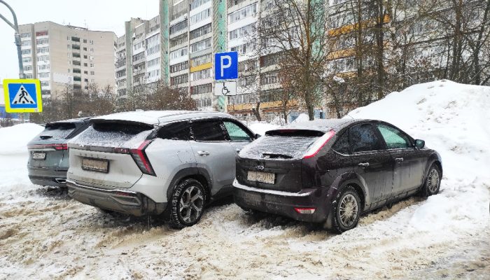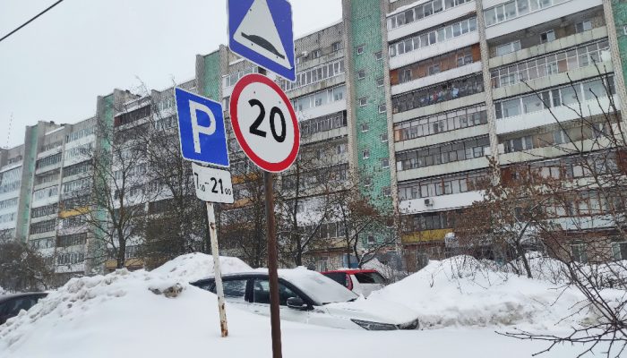 Рядом с ближайшим проездом от дома, идущим параллельно пр. Циолковского, есть дорожные знаки, указывающие, что здесь находится организованная парковка. Но, увы, и она безнадежно утонула в сугробе. Расчищены разве что 2-3 места для инвалидов, на которые встают все подряд.