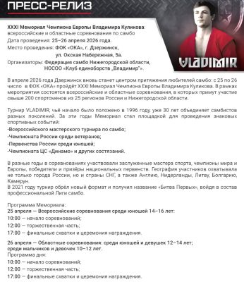 25-26 апреля в ФОК «Ока» Дзержинска пройдет XXXI Мемориал Чемпиона Европы Владимира Куликова: всероссийские и областные соревнования по самбо (16+).