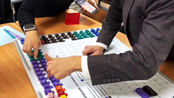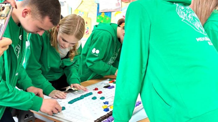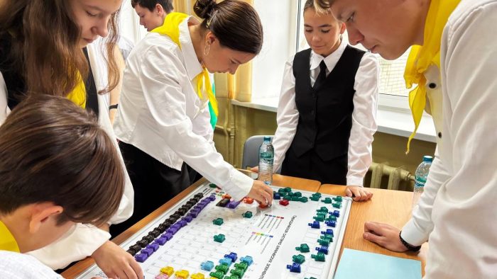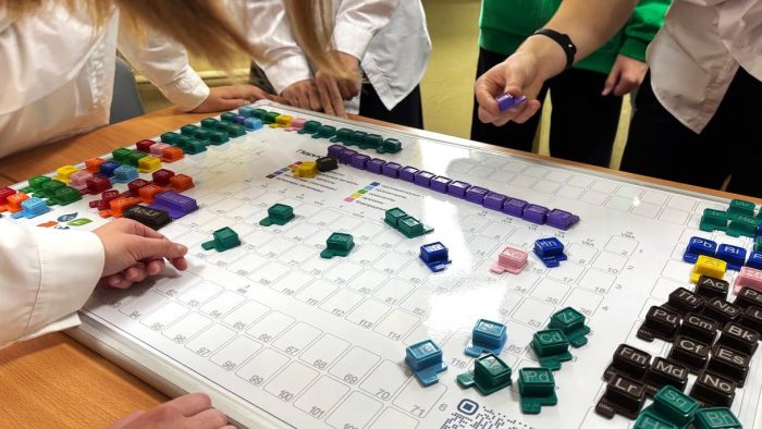 Одним из этапов стало составление таблицы Менделеева из переработанных пластиковых крышечек, выполненных в виде пазла. Однако вместо картонных элементов командам выдали сотни разноцветных пластиковых деталей.