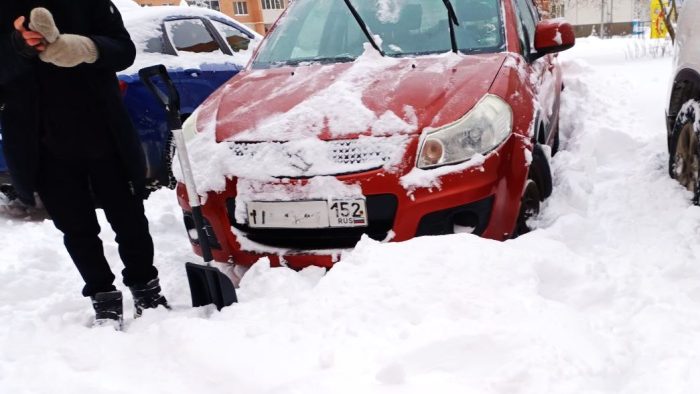 Если автомобиль застрял в снегу и не может выехать, придется повозиться еще больше. Начать нужно с полного освобождения ведущих колес – они должны свободно вращаться. Также потребуется расчистить пространство перед ними — минимум 30–50 см. Возможно, придется пожертвовать ковриками, подложив их под колеса, если поблизости не найдется веток, картона или песка – все это поможет улучшить сцепление.