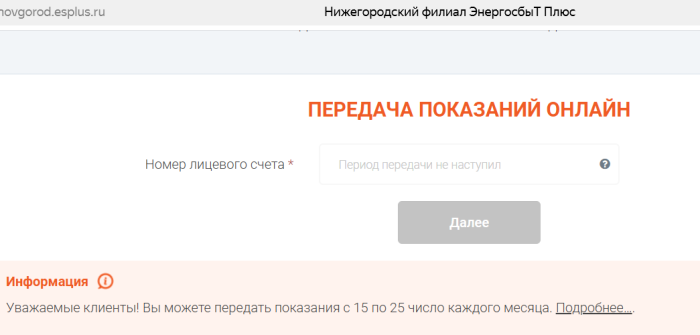В бумажных счетах от Нижегородского филиала «ЭнергосбыТ Плюс» (бывший ЕРКЦ) даты передачи показаний не указаны. На сайте же есть информация о приеме таких данных с 15 по 25 число.