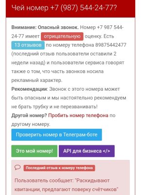 К слову, «репутация» у номера, по которому нужно «оставлять заявку на поверку счетчиков» уже с душком. О нем оставлено немало негативных отзывов в интернете.