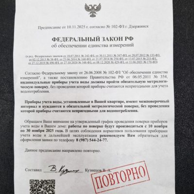 В Дзержинске рассылка поддельных квитанций о поверке и замене счетчиков воды в квартирах, похоже, перестала срабатывать и приносить прибыль сомнительным дельцам. Поэтому они вместо платежек с внушительными суммами теперь изготовили предписание. Цель бумажек, рассованных в почтовые ящики домов дзержинцев, все та же – ввести в заблуждение хозяев квартир и взять с них деньги за ненужную и скорее всего ненастоящую услугу.