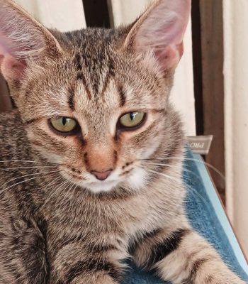 Братикам (это мальчики) по 2-3 месяца. Один расцветкой – копия мамы, имеет гладкий камышовый в полоску окрас и ясные янтарные глаза. Второй – пушистый белый с серым и светло-коричневыми подпалинками возле ушей. А глаза у него чисто зеленые. Оставшись без мамы, они как будто поняли, что ближе друг друга у них никого нет и все делают вместе: спят, едят, бродят по квартире.