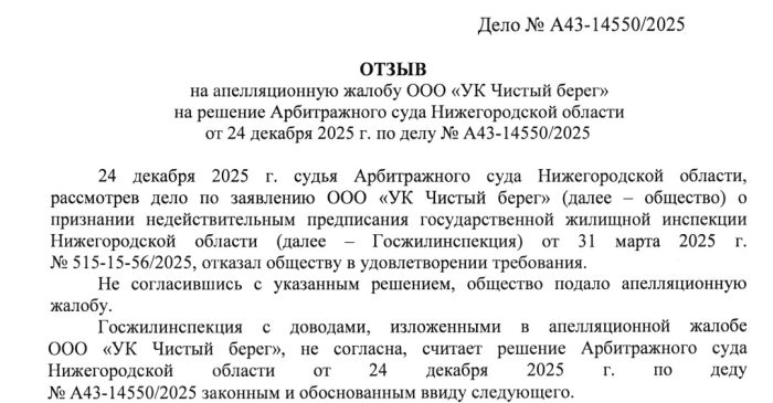24 декабря прошлого года Арбитражный суд Нижегородской области вынес решение по делу А43-14550/2025, где отказал «Чистому берегу» в удовлетворении требований.