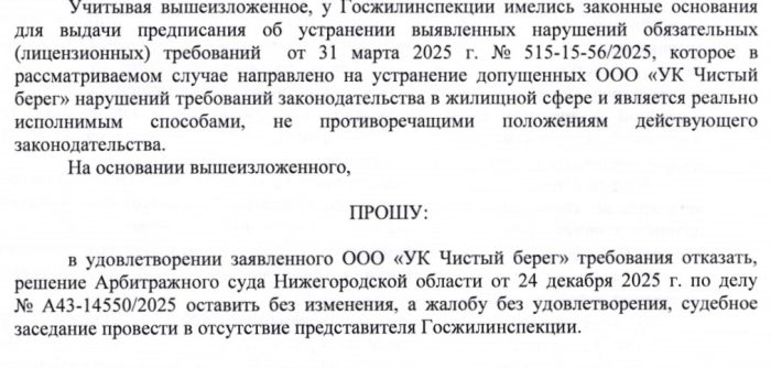 Специалисты ГЖИ в отзыве просят отказать УК «Чистый берег» в заявленных требованиях, оставить жалобу без рассмотрения, а решение суда — без изменений.