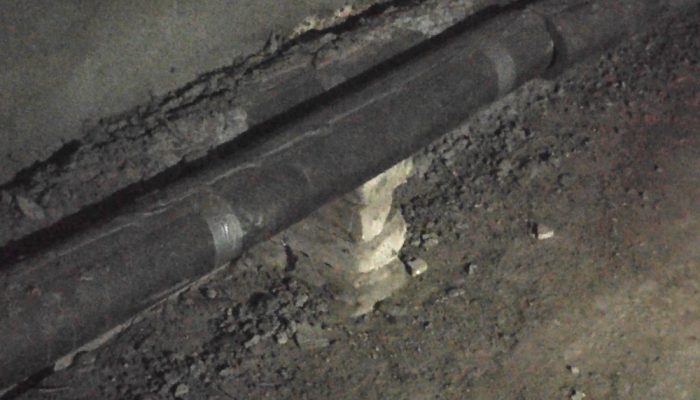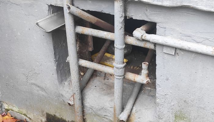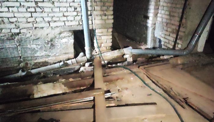 В-третьих, одна из предпринимателей зачем-то углубила яму под домом, оголив фундамент примерно на полметра. Из-за этого лежавшие ранее на земле трубы отопления теперь повисли в воздухе и держатся только на нескольких кирпичных опорах, подложенных на скорую руку. Все это нужно закреплять более надежно, иначе не избежать аварий.