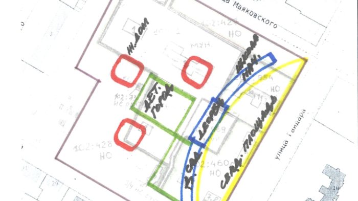 На схеме архитектора — камерная свадебная площадь (ведь депутаты давно говорят, что городу нужен хороший ЗАГС), дворец бракосочетания. Рядом, простите, переосмысленный курдонер, это дословно, детский сад и начальная школа.