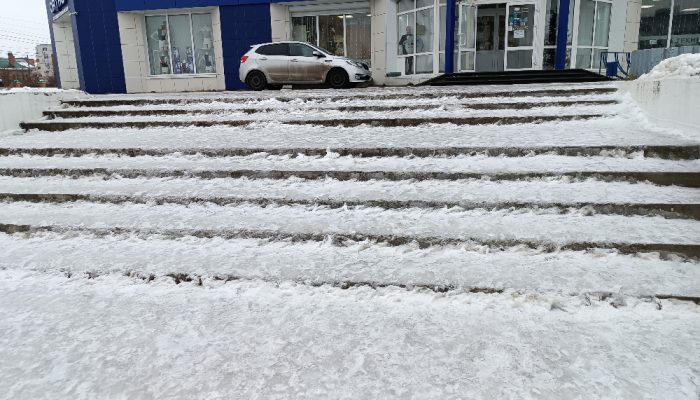 А вот ступени к магазинам на пр. Циолковского – практически готовая снежная горка. Лестницы явно никто не чистит. Подняться и спуститься стоит больших трудов.