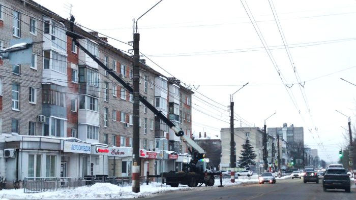 Снег и наледь с крыш домов сбивают только со стороны центральных улиц.